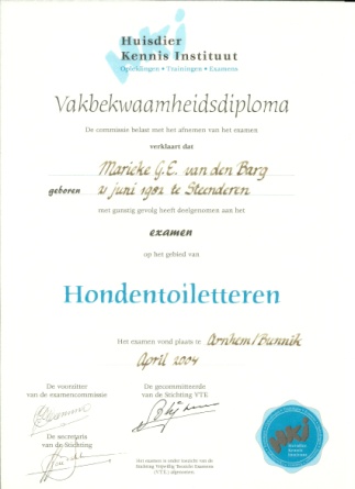 Tijdens mijn middelbare school periode heb ik heel veel ervaring opgedaan in het houden en omgaan met honden. Na het behalen van mijn diploma honden toiletteren ben ik als zelfstandige verder gaan werken in mijn eigen salon, die ik aan huis heb.